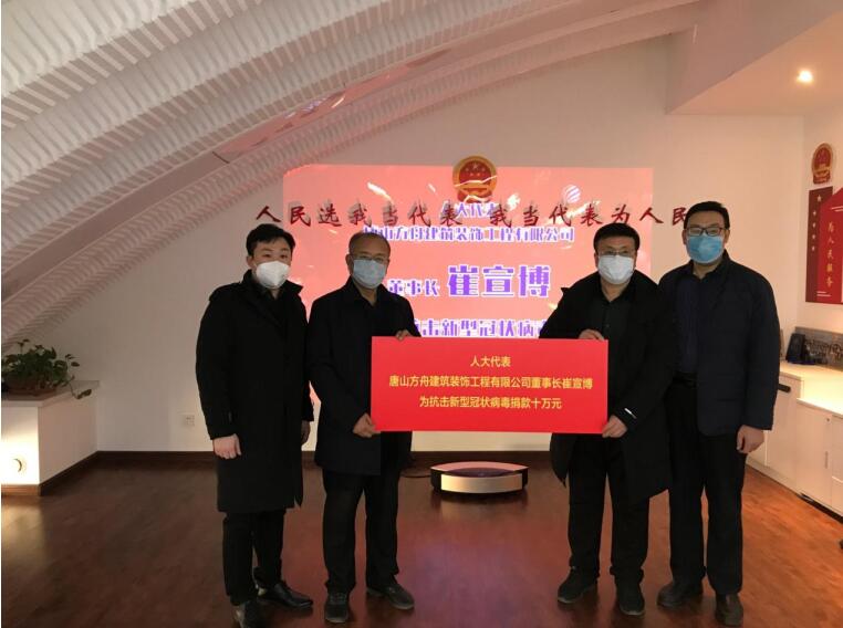 作為市、區(qū)兩級人大代表的博海方舟集團董事局主席崔宣博春節(jié)期間率先啟動抗擊新冠肺炎疫情防護愛心捐款行動, 代表方舟建設集團有限公司捐款 10 萬元(其中: 5 萬捐給武漢用于抗疫; 5 萬捐給路北區(qū)用于防疫),用自己的實際行動為武漢和路北區(qū)抗疫防治工作貢獻著一名人大代表的一份力量,彰顯出一位民營企業(yè)家的家國情懷和責任擔當。
